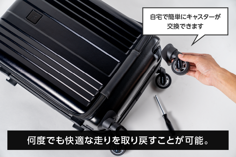 荷物を預けた際の破損のリスク、2輪走行の多用によって失われる快適な4輪走行時のバランス。キャスターだけを交換可能な設計にすることでそれらの問題を解決しました。
